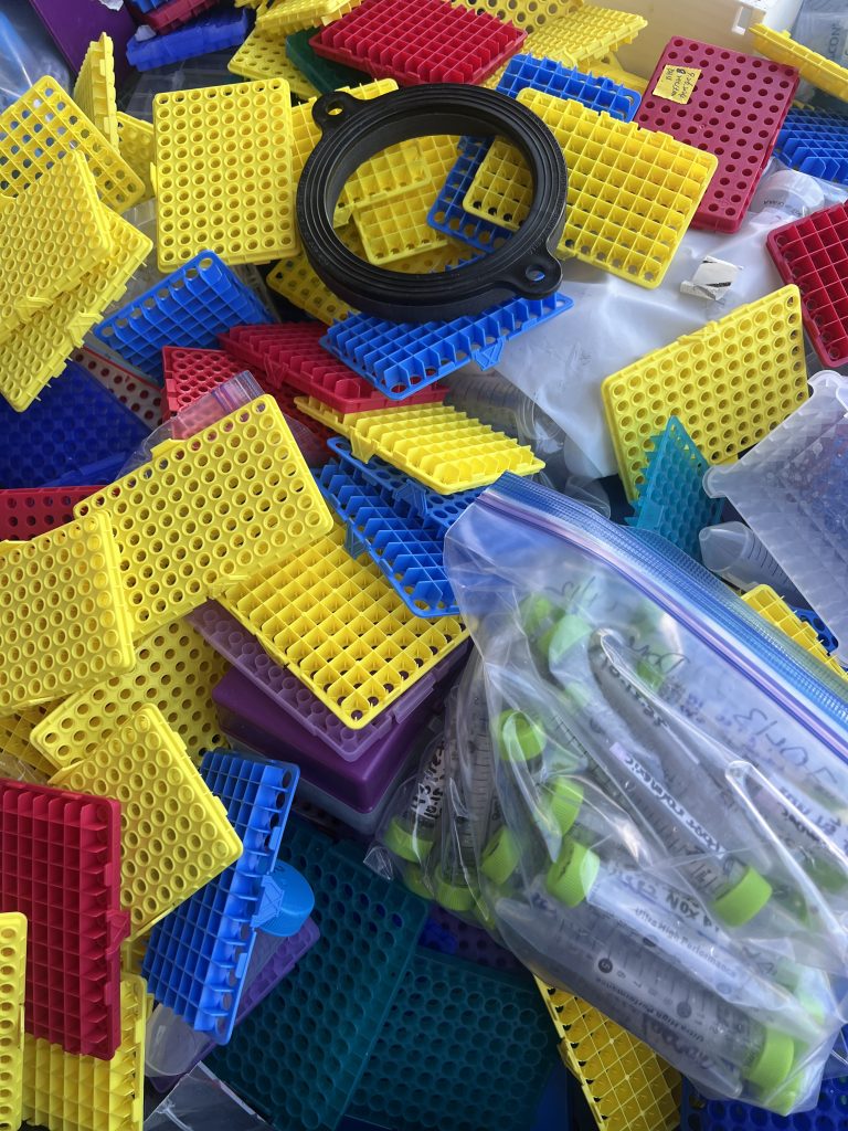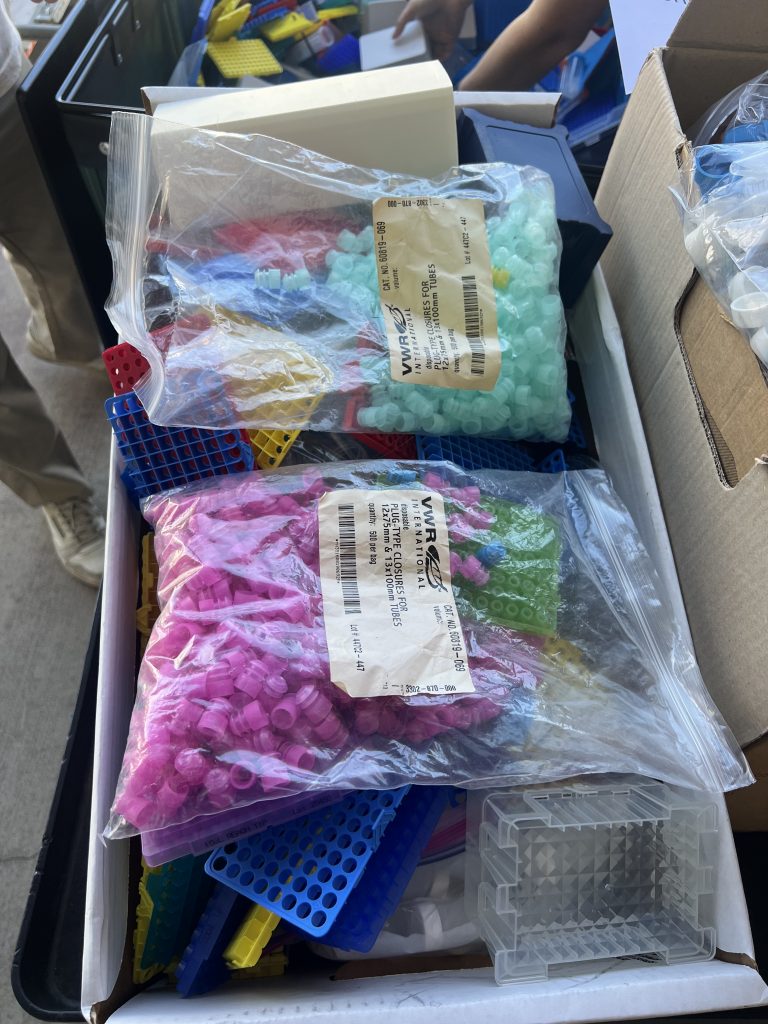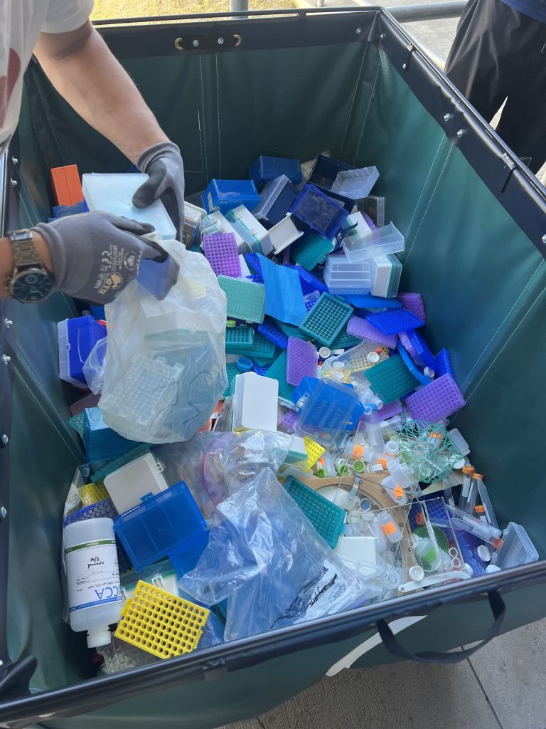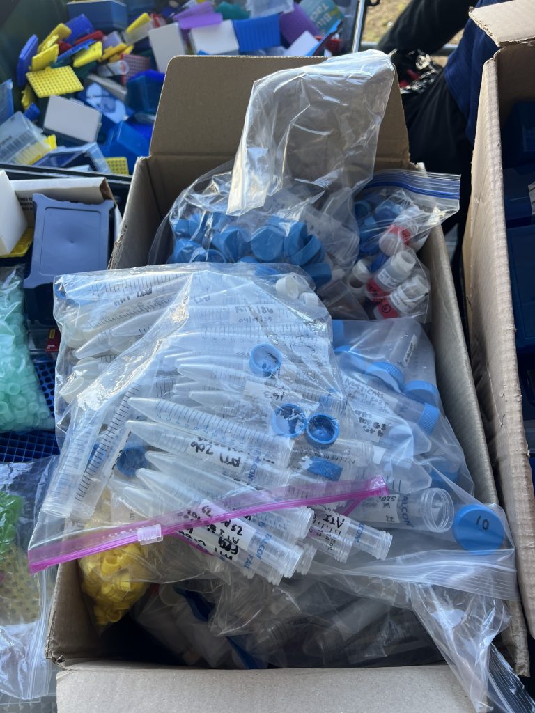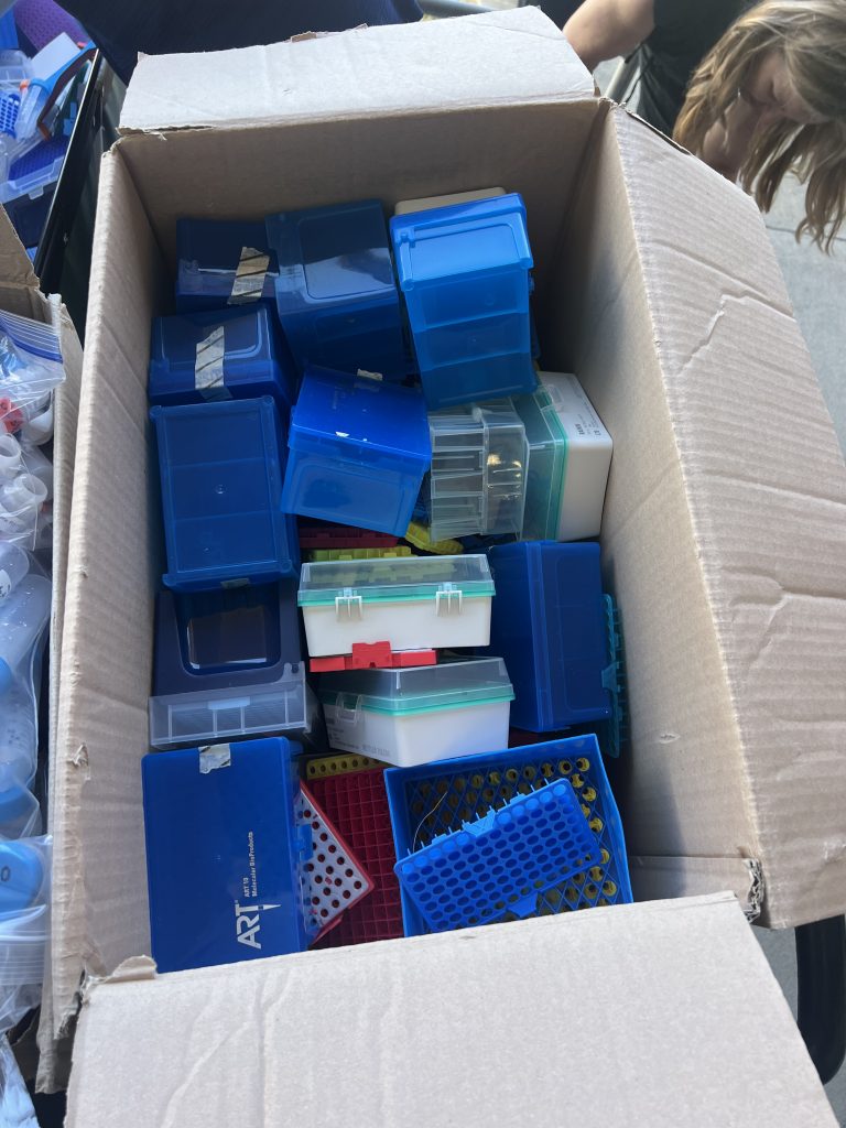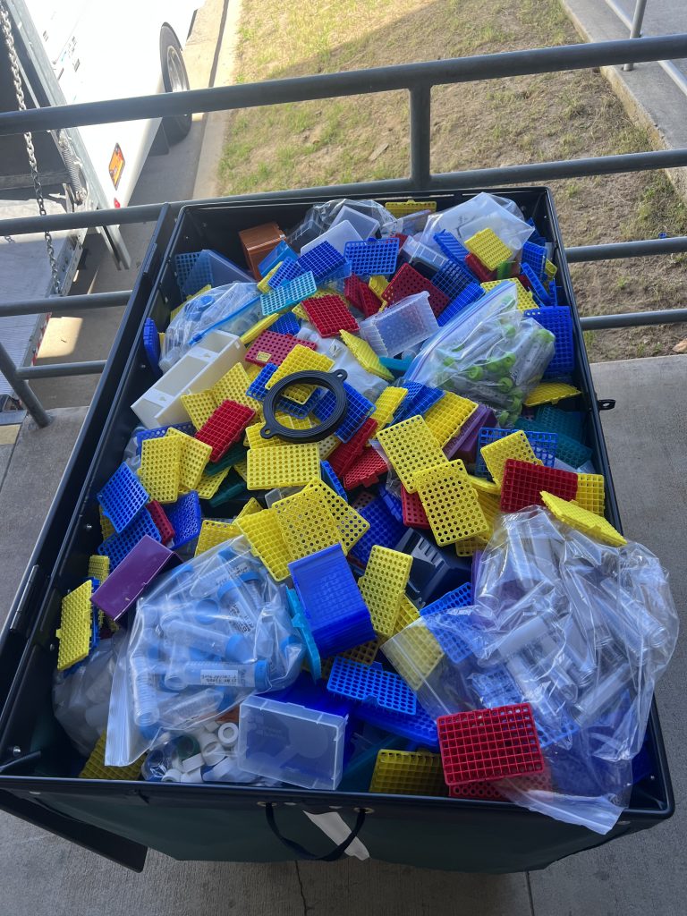 All clean, dry, and non-hazardous lab materials are accepted through the green AFS donation bins in your lab building. Labels do not need to be taken off to donate materials.